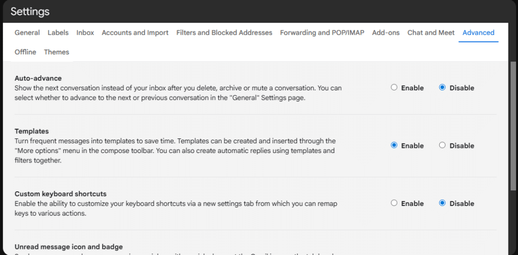 First you need to enable templates in your Gmail settings. Click on the gear icon in the top right to open settings. If necessary click the “See all settings” link to go to the full settings.