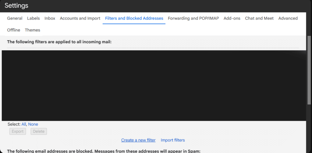 Go back to the Gmail settings and go to the ‘Filters and blocked addresses’ tab. If you’ve never set up a filter it will be a bit empty. Click on ‘Create a new filter’.