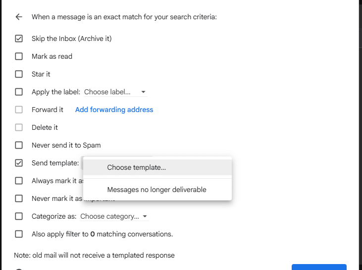 Click ‘Create filter’. In the next form select ‘Skip the inbox’ and ‘Send template’ checkboxes. For the send template setting choose the template you just made.
